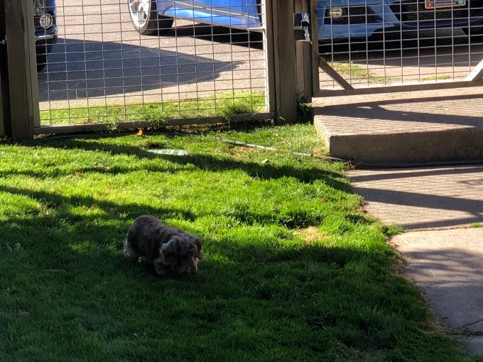 So making sure the yard crew closes all the gates and takes their mighty engines on the other side of fence, I try to get the Zoi. She so enjoyed the game of “you can’t catch me” she decided we were playing. OH SHIT!!! I trudge back in the house to find a bag of treats and scream to the rafters how mad I am at me for not thinking more about why the dogs wanted to be let out. They knew the lawn crew was here, maybe they would like to play.