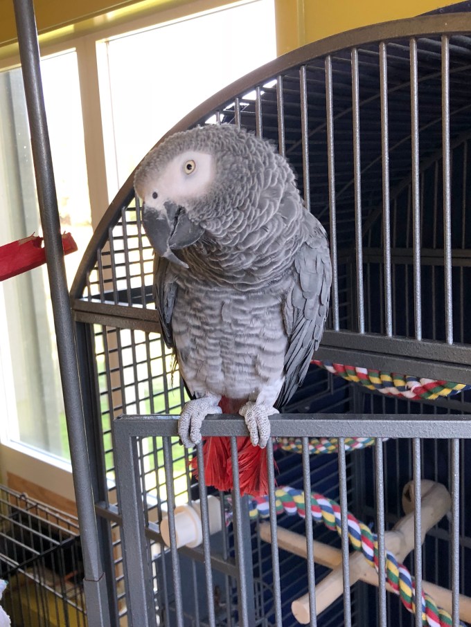 I put Harpo down and immediately notice another African Grey is on the ground and I am worried that Harpo will be attacked. But Katie is not worried for either bird and encourages me to relax. The two birds walk around each other investigating and then both of them fan their tail feathers like peacocks only their fans are almost fully round and look like hammered gold discs with embedded gems of every color. They both are quite pleased with their fans and I am stunned at this new talent of Harpo’s. His mandala fan tail is shimmering and glittering. He is quite amazing.