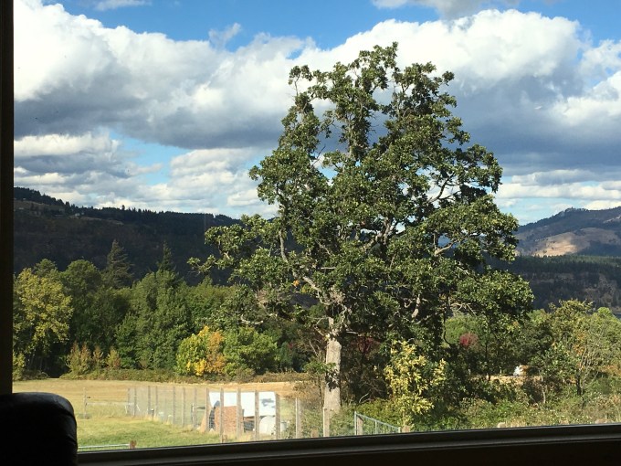 The lawn is strewn with early leaves and the Gorge’s sky is boastfully parading clouds whose random clusters pattern moving shadows across the hills as they march west to east. Its well and truly Fall.