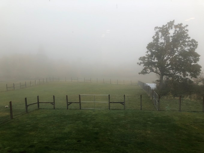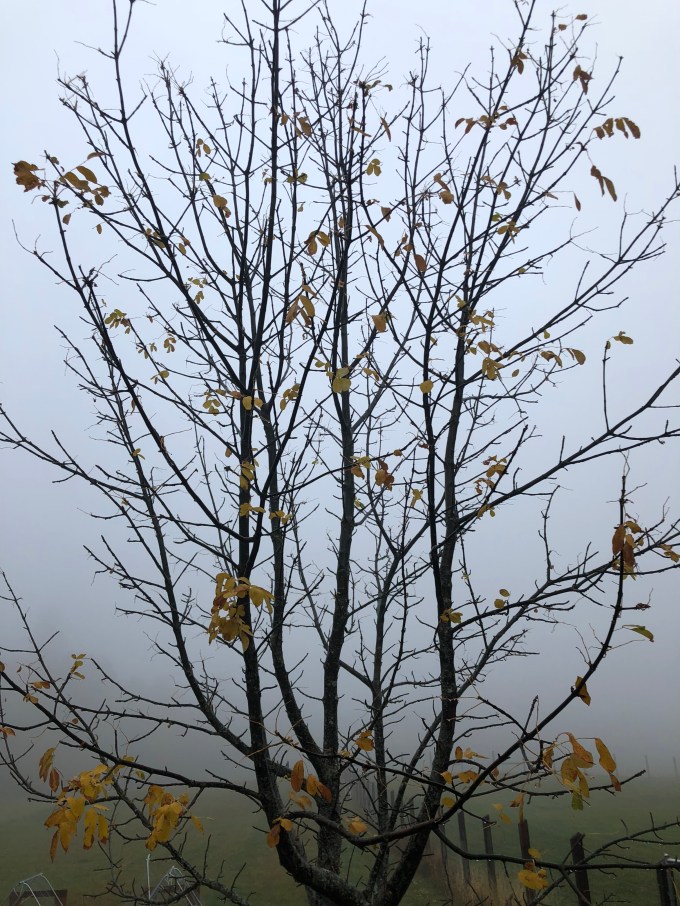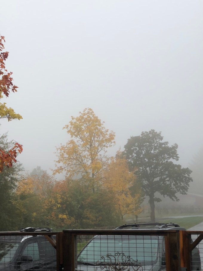 I woke to dim dark in the early morning and heard rain melody on the gutter organ, the pit pit pit on metal and the gentle swoosh through shoots channeling the draining off the roofline. Dim dark lightened ever so slow to dim light. The cloak of fog was covering the morning. My world was completely changed.