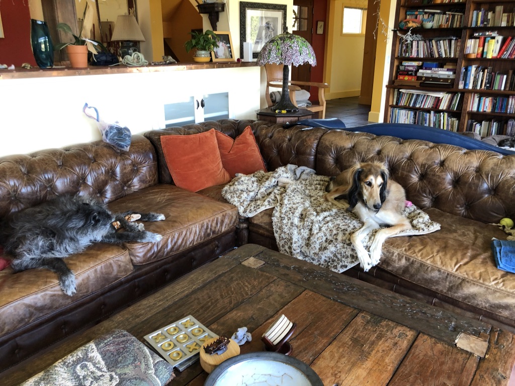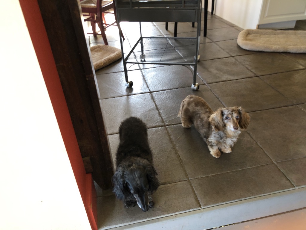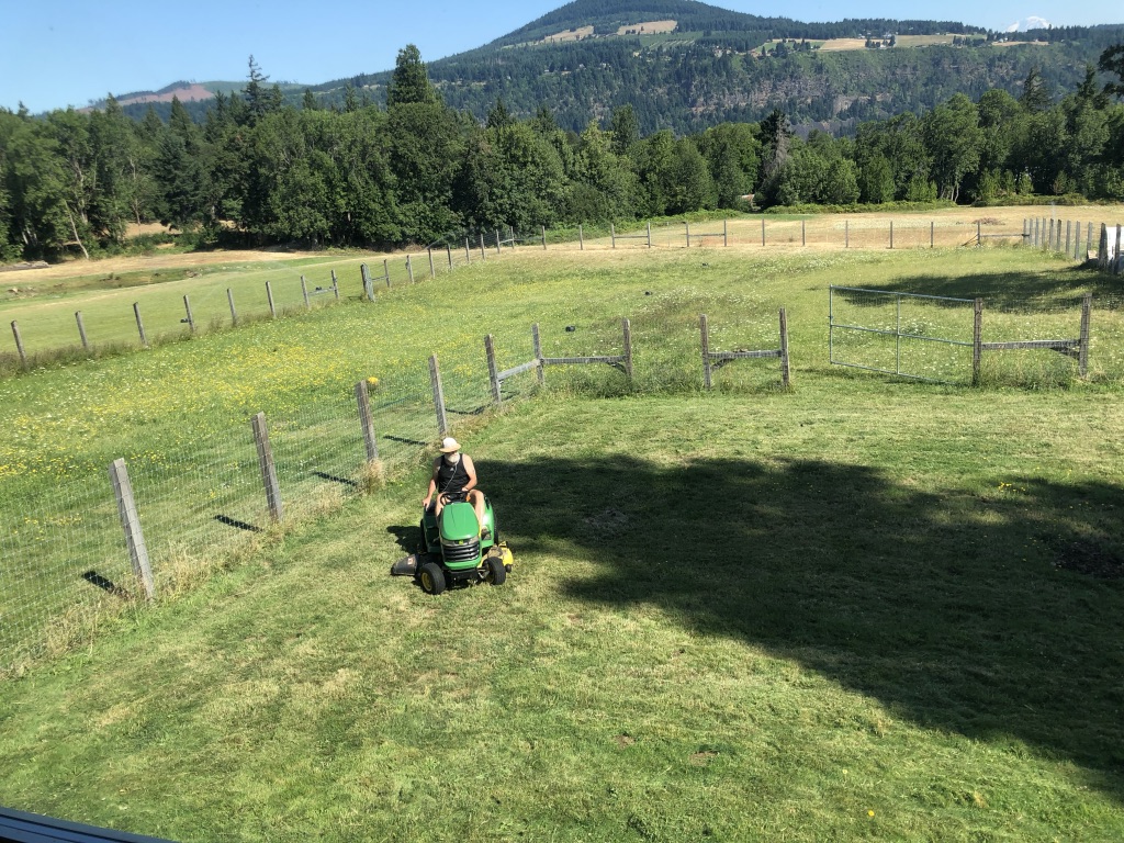 The grass keeps growing so Husband is mowing. The AC buzzes cool so I can think. Dogs are strewn across the floor and furniture. I need to pee.