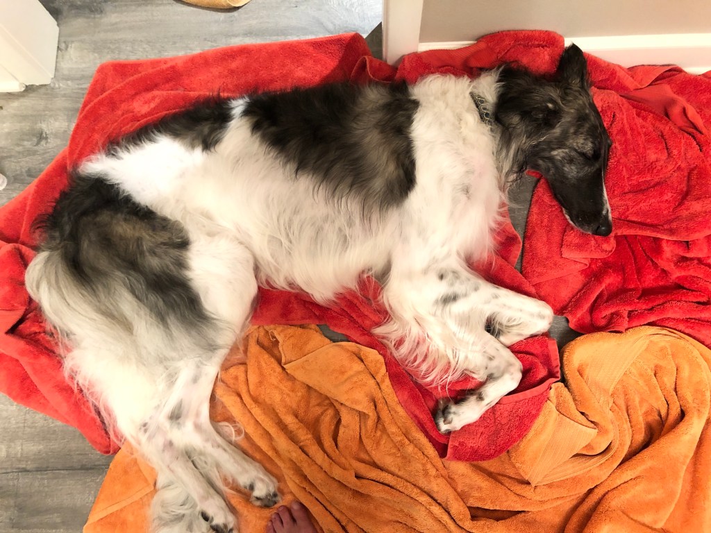 So after paying bills and fielding Angel Yard Crew of Three I asked The Princess Zoi to join me for our Pre Show Weekend Spa. We both survived and even nail trimmed torture. Zoi fell asleep on soggy towels.