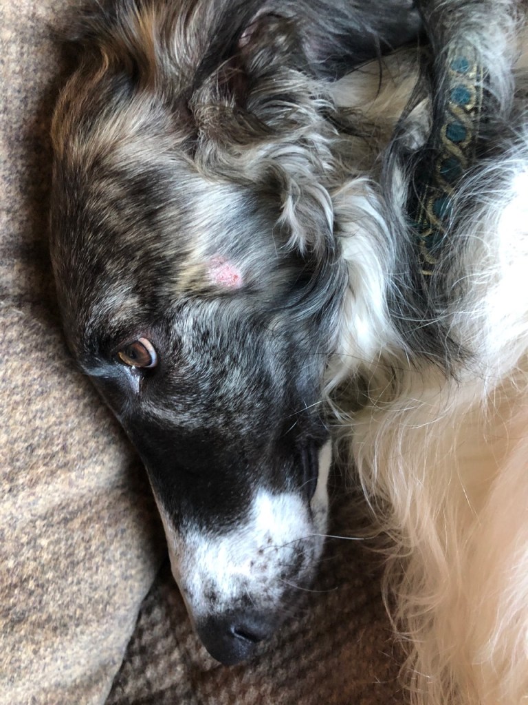 But damn, the Zoi Huntress of those ever teasing squirrels that leap along the branches in her yard, somehow rammed her lovely cheek bone up against a rock I figure last weekend and sure enough, because she heals so well has lost the fur above the scab. Well, lets just see how she does this weekend.