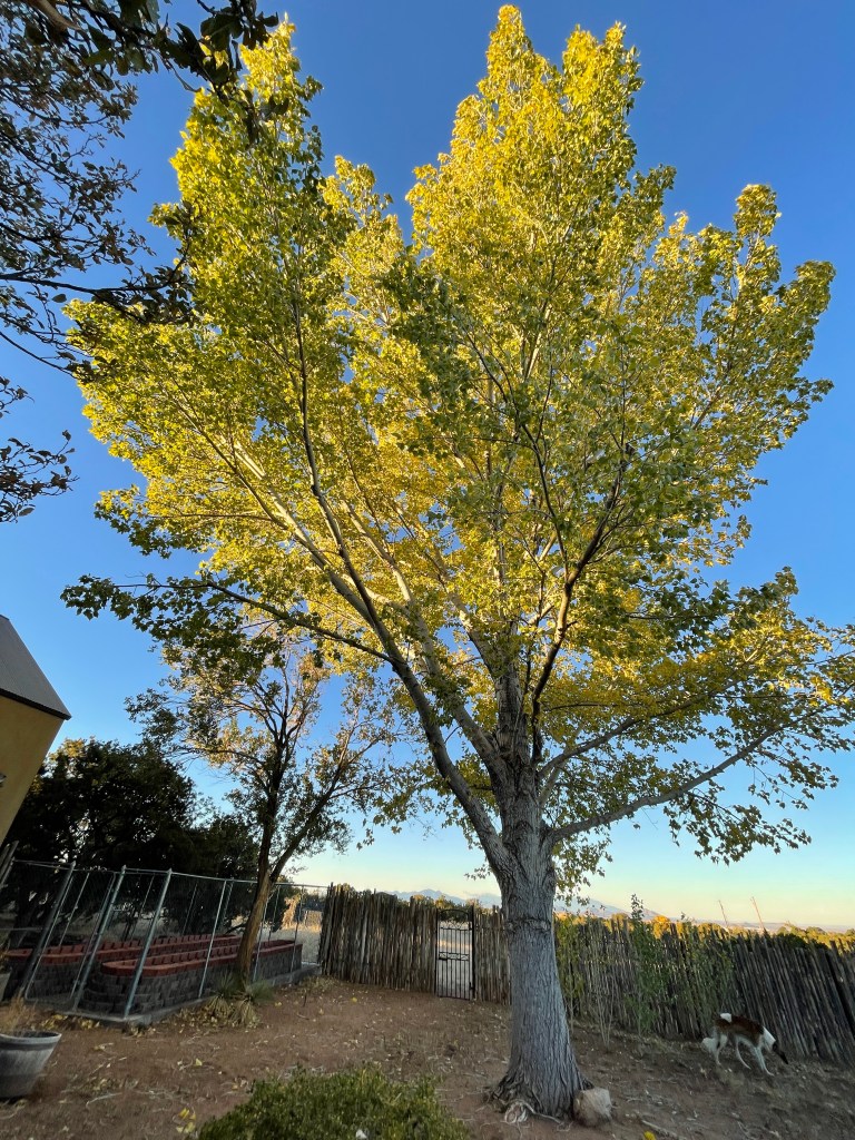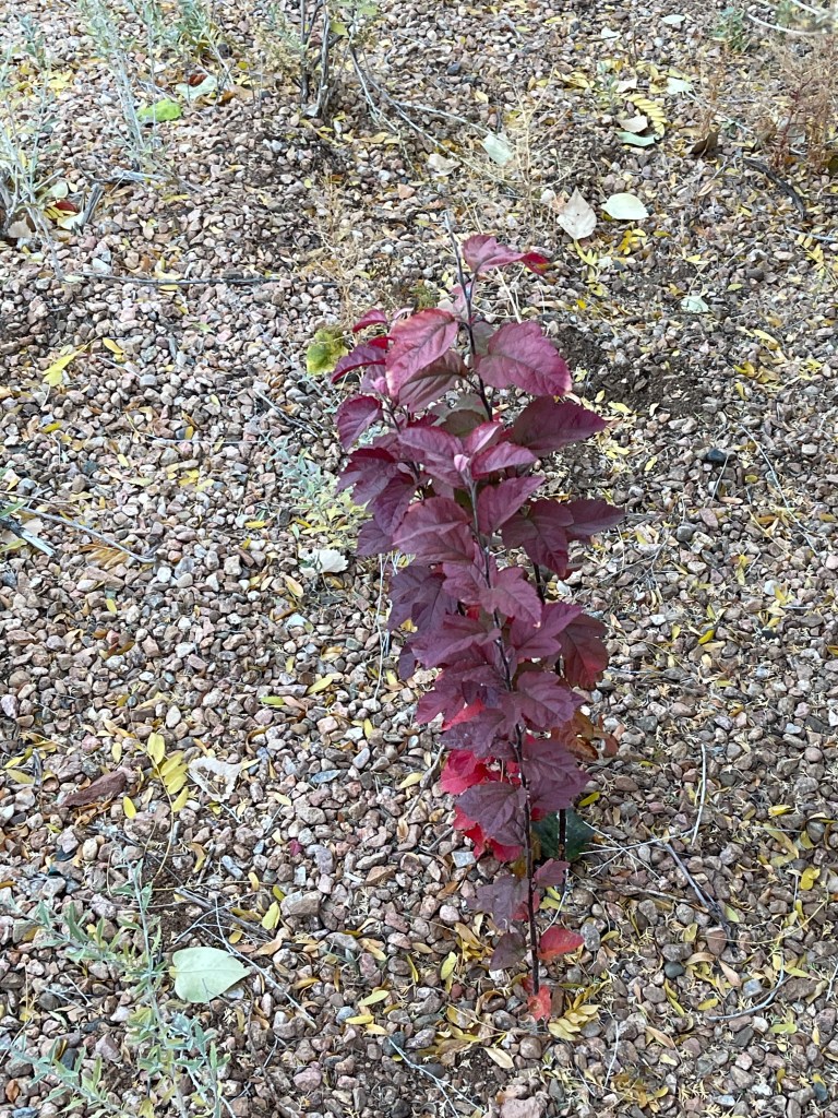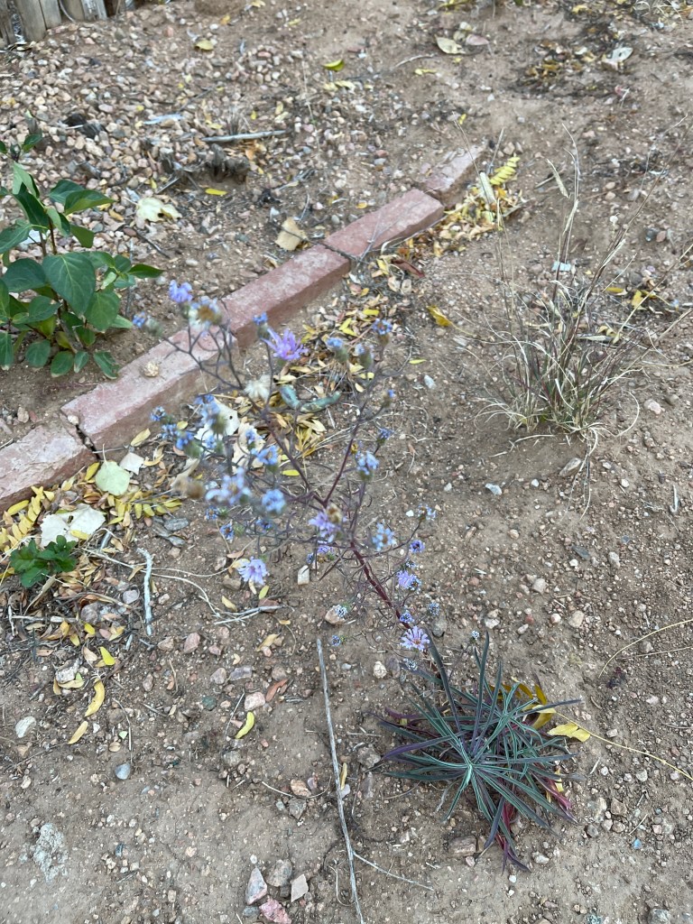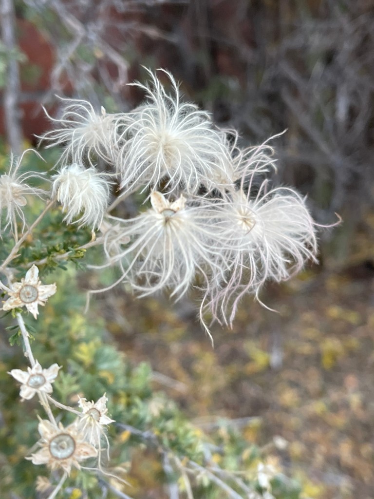Today is poo collection day for testing just in case someone is packing guests. Its early day and light is diffused and dim. As I move through the yards, the magic in this ground winks up at me. Its late October and every body’s leaves are singing through their last feeding days with rainbowed colored cadences. But the surprise for me this am is all the little single colored creatures scattered beaming color at my delight in them. And Apache Plume wafting its late feathers at me, oh the magic of this place.